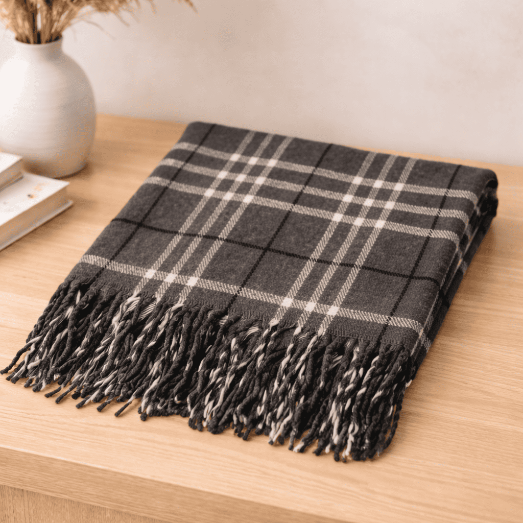 La Frazada Home es la definición de confort discreto y elegante. Su diseño en cuadros gris carbón con líneas finas crea una estética moderna, limpia y versátil que se adapta perfectamente a cualquier espacio: desde una recámara minimalista hasta una sala contemporánea.